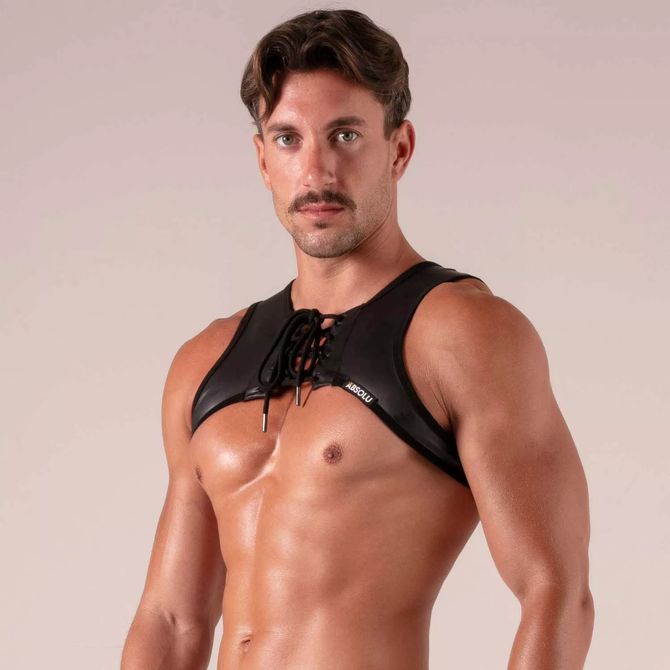 Bringen Sie Ihre Sinnlichkeit mit Kraft zum Ausdruck dank des Bondage-Harnesses, einem ikonischen Stück Fetisch-Dessous für Männer. Dieses kurze Harness aus atmungsaktivem Kunstleder spielt mit dem Thema des kontrollierten Verlangens mit einer verstellbaren Frontschnürung, die von BDSM und schicker Fetischästhetik inspiriert ist. Sein figurbetonter Schnitt schmiegt sich an den Oberkörper und betont jeden Muskel, jede Linie, jede Absicht. Eine Geheimtasche ist integriert.